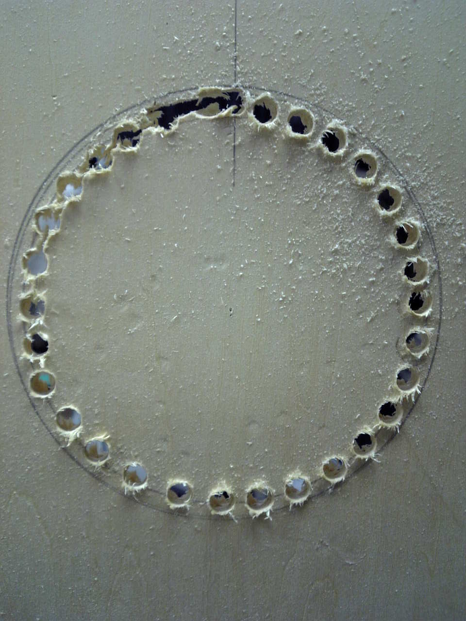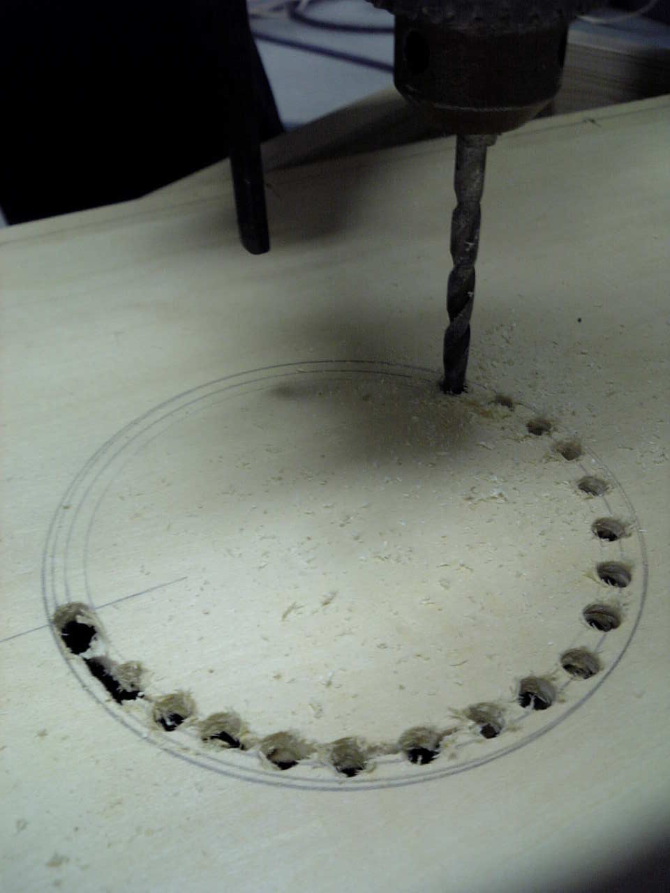 まず木ねじをねじ込む穴の位置を寸法し、きりで下穴を空ける。